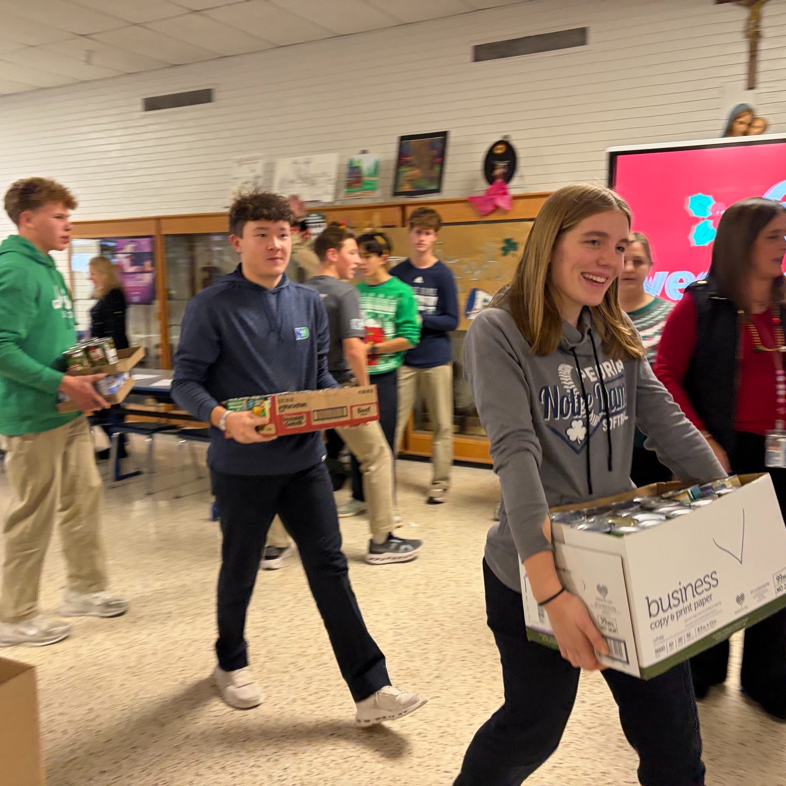 The 2025 Christmas Basket Drive was a huge success! 🎄🥫 Our students and staff participated in our annual “Packing and Sorting” event after school on Friday afternoon to prep all of the boxes for delivery the following morning. The students packed 360 boxes plus additional loose items! Each box also came with a ham, oranges, and bread. These boxes were distributed to local food pantries through St. Vincent de Paul societies at St. Ann’s, Holy Family, St. Mark’s, St. Phil’s, St. Thomas, and to Sophia’s Kitchen. Special thanks to All School Council members, Mrs. Hausauer, and Ms. Santen who planned and implemented our whole drive. Also, huge congratulations to Viator House who garnered the most points total amid a very fierce competition for raffle tickets, weekly can turn in, evening drive participation, and packing & sorting attendance.