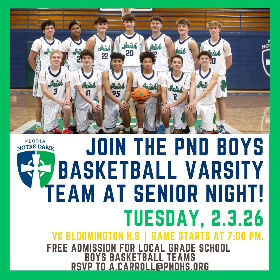 All local grade school basketball teams: Join us for our upcoming basketball senior nights! Lady Irish vs Richwoods High School this Friday, 1/30/26 at 7 PM PND Men’s Basketball vs Bloomington High School next Tuesday, 2/3/26 at 7 PM Please RSVP to Annie Carroll at a.carroll@pndhs.org for your grade school team to be recognized at...Read More