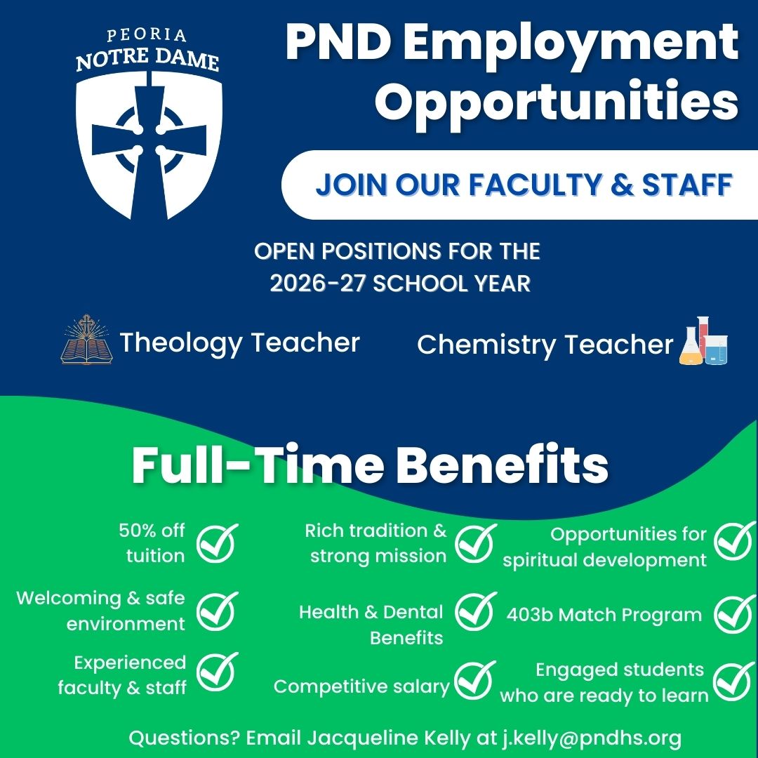 Join in the mission of forming disciples in a community of Catholic faith, knowledge, and service at Peoria Notre Dame! We have two openings for the 2026-27 school year for a theology teacher and a chemistry teacher. 🙏 ⚛ More information, including specifics on benefits, can be accessed on our website at this link (https://www.pndhs.org/employment/) or you can fill out an application directly through CDOP at this link (https://www.applitrack.com/cdop/onlineapp/default.aspx…).