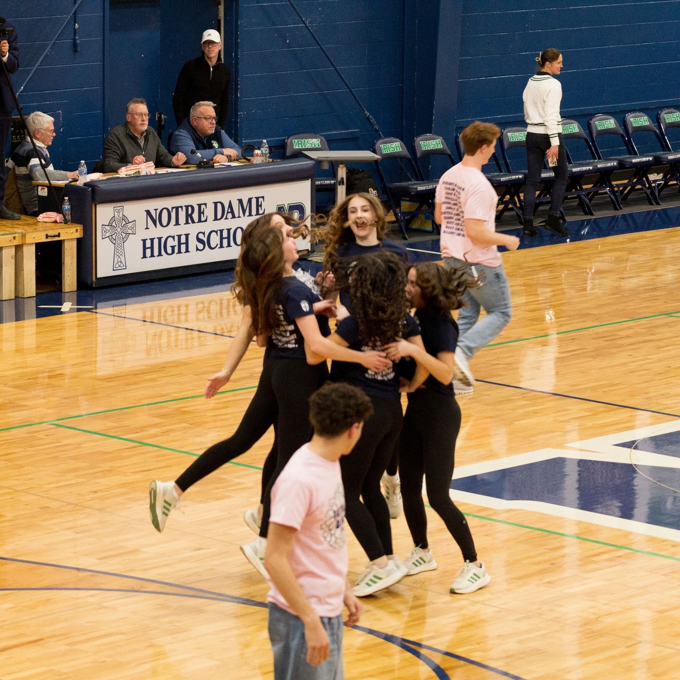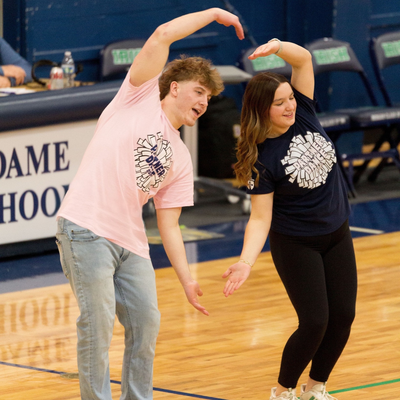 Last night during the last home boys basketball game, the Peoria Notre Dame Dance Team performed their annual partner dance! The large crowd was entertained as 11 senior boys joined dance team members to put on an entertaining show during halftime. As always, it was a crowd pleaser! Partners included: