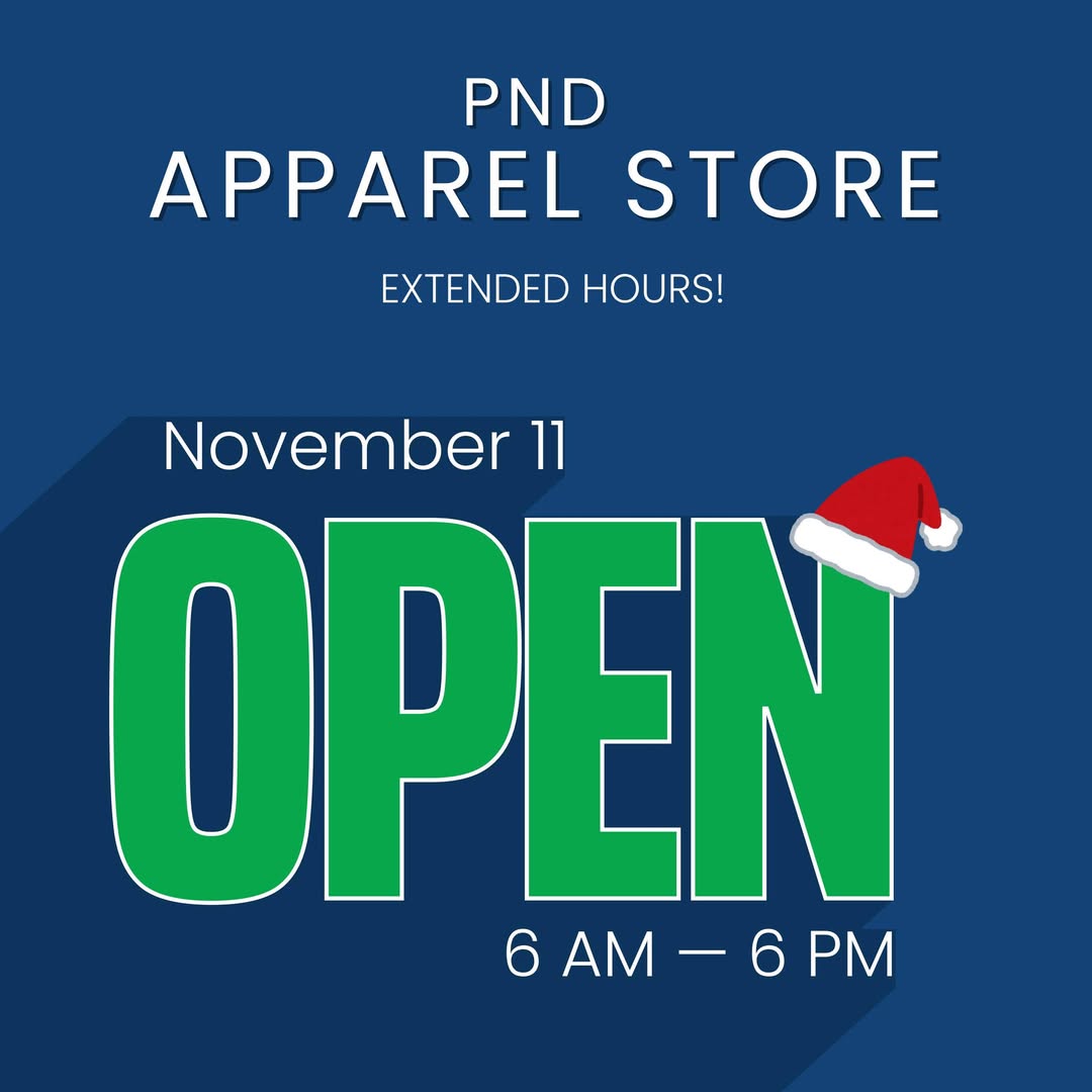 The PND Apparel Store will be open extended hours on Tuesday, November 11. We will have new items in infant all the way up to 2XL. Visit the store between 6 am and 6 pm and find gifts for every person on your list!!! Enter the building through Door #13 at the back of the...Read More