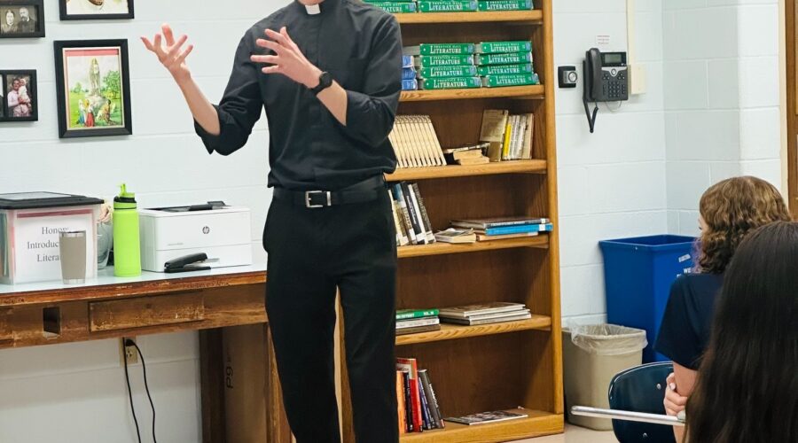 Students in Introduction to Literature have been exploring the themes of fate, destiny, and soulmates through reading the play Romeo and Juliet. Father Daniel joined the class to speak to the students about how Jesus Christ is our one true soulmate, who is the one who will make us perfectly happy as we grow in holiness.Read More