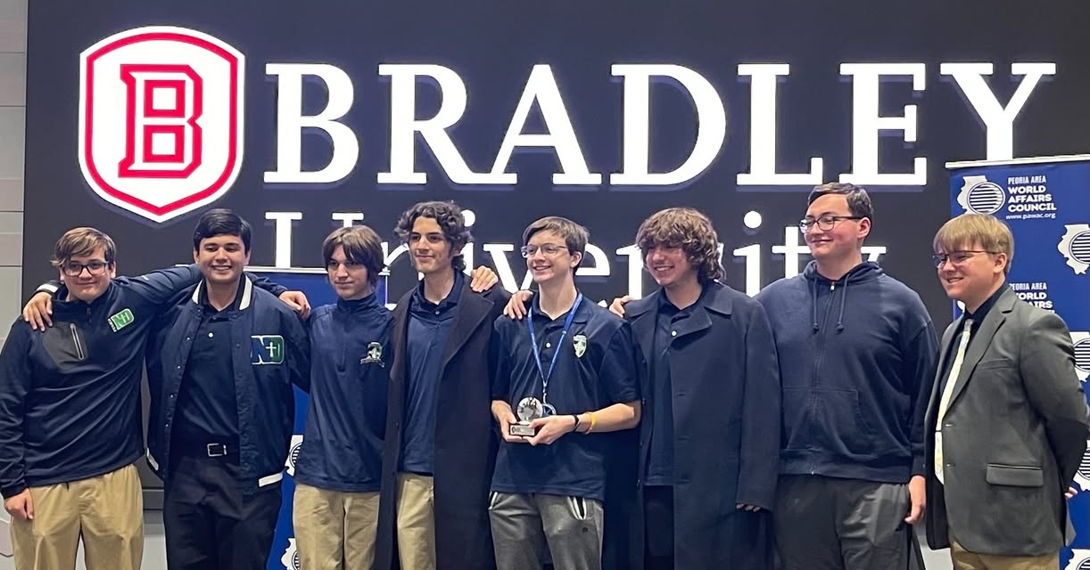 Congratulations to the PND Scholastic Bowl for finishing 2nd at the PAWAC Tournament at Bradley University Saturday, November 8th. The Irish defeated East Peoria, St. Thomas More, and Richwoods on their march to the Championship. Special congratulations to Liam Hamilton, who earned a spot on the All-Tournament Team! (Pictured from the left to right in the first photo): Noah James, Matthew Bennett, Owen Robotham, Sebastien Robotham, Liam Hamilton, Nathaniel Howard, Barrett Gangloff.