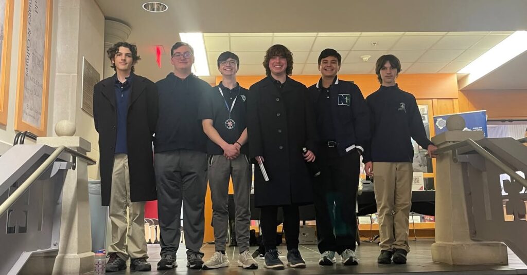 Congratulations to the PND Scholastic Bowl for finishing 2nd at the PAWAC Tournament at Bradley University Saturday, November 8th. The Irish defeated East Peoria, St. Thomas More, and Richwoods on their march to the Championship. Special congratulations to Liam Hamilton, who earned a spot on the All-Tournament Team! (Pictured from the left to right in the first photo): Noah James, Matthew Bennett, Owen Robotham, Sebastien Robotham, Liam Hamilton, Nathaniel Howard, Barrett Gangloff.