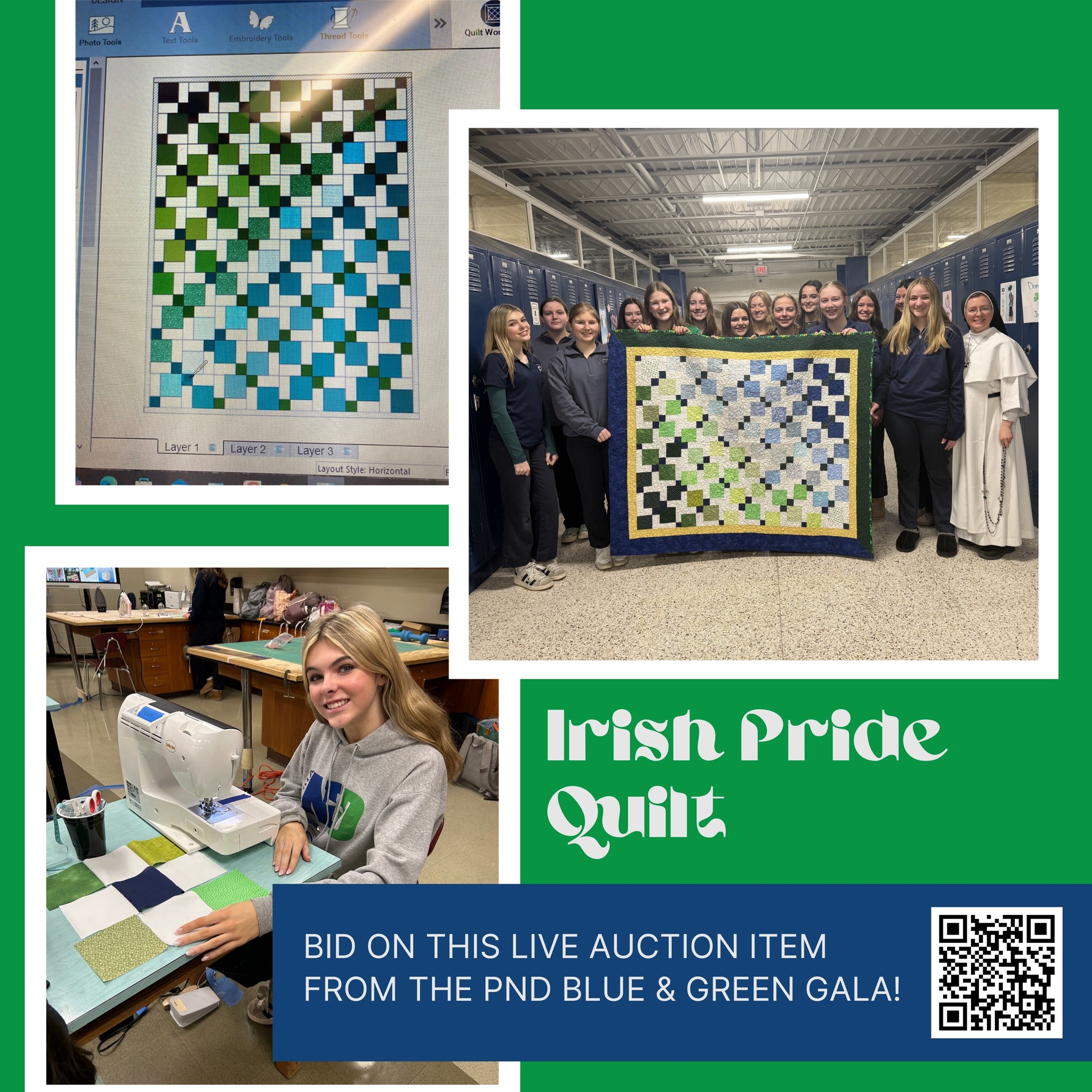 From concept to completion, PND students in Sr. Jude Andrew’s Winterim Quilting class handmade a beautiful keepsake quilt just for the 2026 Blue and Green Gala: PND Goes for Gold! With the support and mentorship of Peoria’s quilting guild, the Gems of the Prairie, students collaborated on every design decision – from color and layout, border choice, a pieced backing, and quilting patterns. Each student worked on a block, and several collaborated on other steps. The color wash of PND blues and greens gives the disappearing nine patch a modern twist. This lovely Irish Pride quilt can be yours by bidding at the auction on March 21. Visit https://pndhs.ejoinme.org/PNDGala2026 to purchase tickets or a virtual bid number.