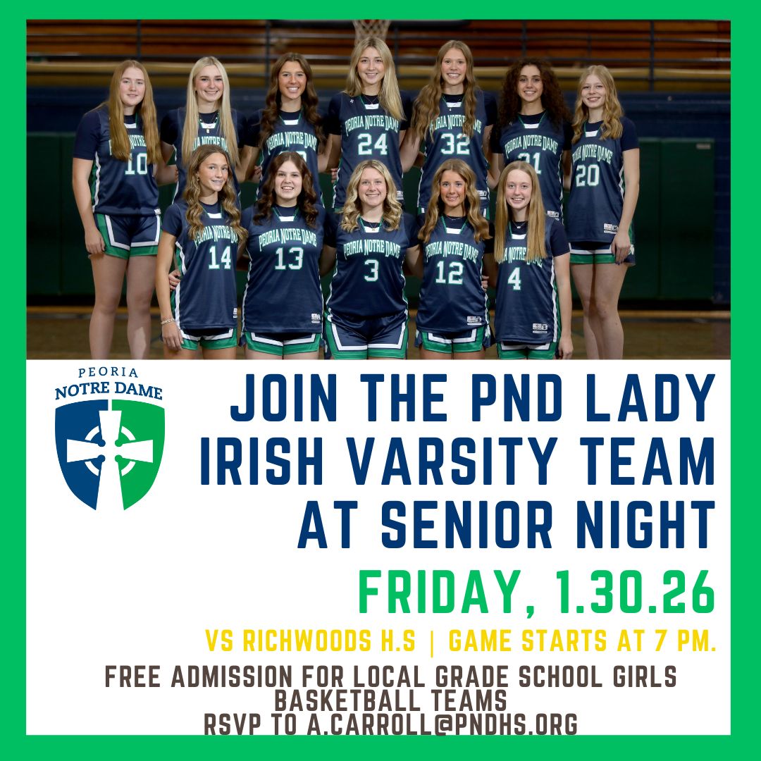 All local grade school basketball teams: Join us for our upcoming basketball senior nights! Lady Irish vs Richwoods High School this Friday, 1/30/26 at 7 PM PND Men’s Basketball vs Bloomington High School next Tuesday, 2/3/26 at 7 PM Please RSVP to Annie Carroll at a.carroll@pndhs.org for your grade school team to be recognized at the game and for ticket numbers. Let’s go IRISH!