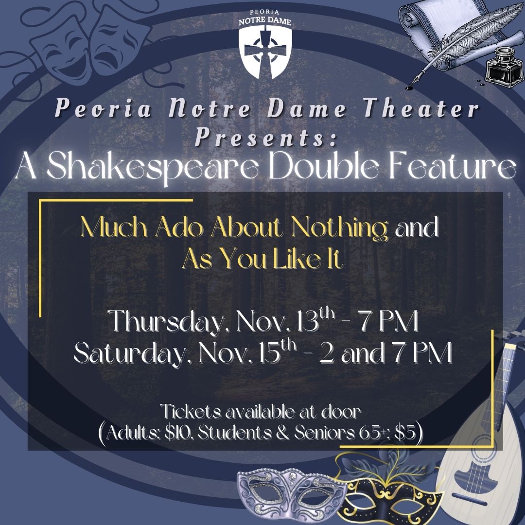 Join us this week for the Shakespeare double feature of “Much Ado About Nothing” and “As You Like It.” The performances are on Thursday, November 13th at 7 PM and Saturday, November 15th at 2 PM and 7 PM. Tickets will be available for purchase in-person during advisory this week and at the doors of the performances! Student and seniors (65+) will be $5. Adults will be $10.