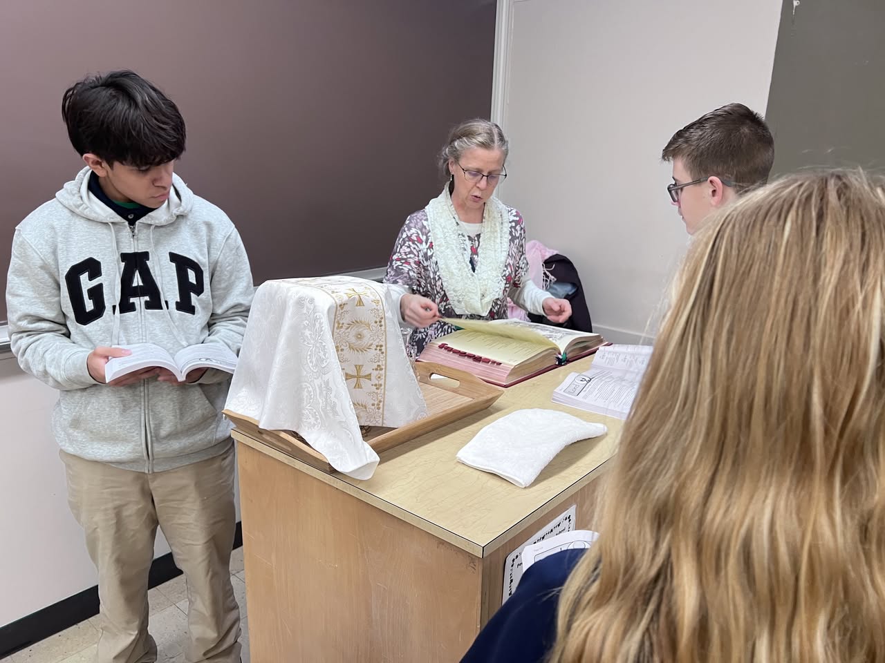 Former teacher Suzanne Krumpleman came back to teach “Behind the Scenes of the Mass” and newly retired teacher Marty Stenoish is once again gracing our halls to prepare students for ACT testing. Our thanks goes to them for imparting their knowledge on PND students.
